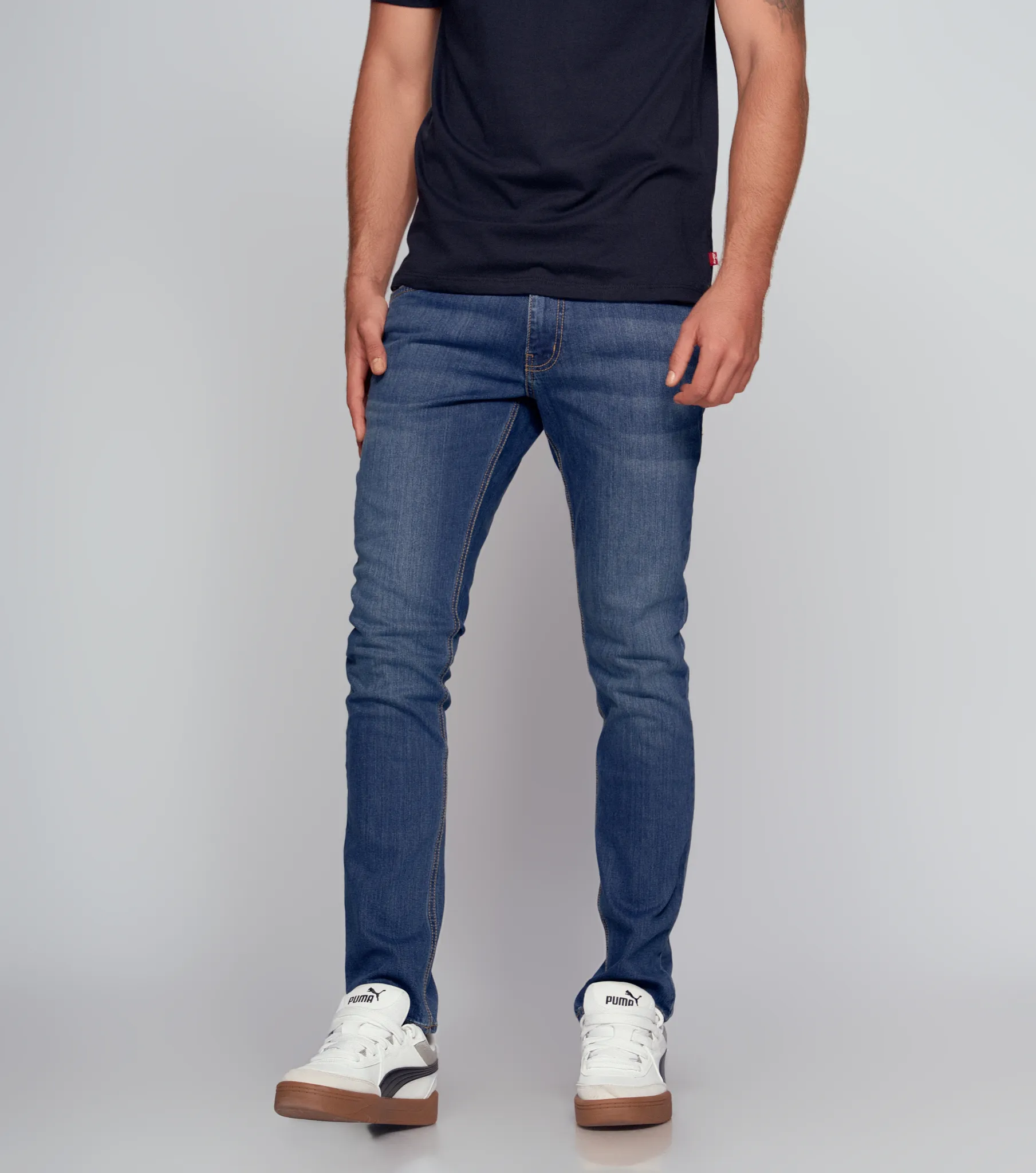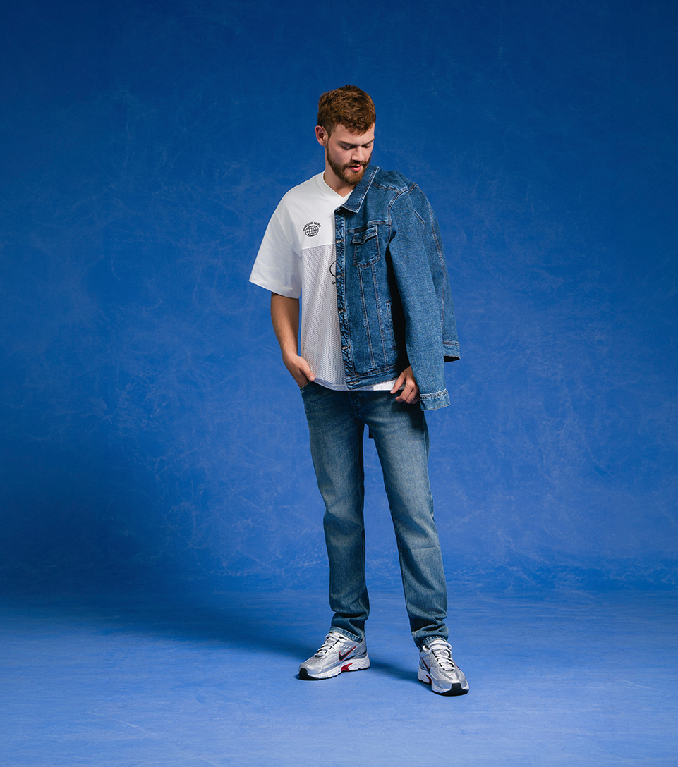 Look deportivo enfocado en la superposición ingeniosa. Combina una camiseta de malla blanca con detalles de cuello en V y logotipos "Sportcore" con una pose relajada, donde una chaqueta de mezclilla de lavado medio cuelga casualmente sobre un hombro. Vaqueros a juego completan la estética urbana y pulida.