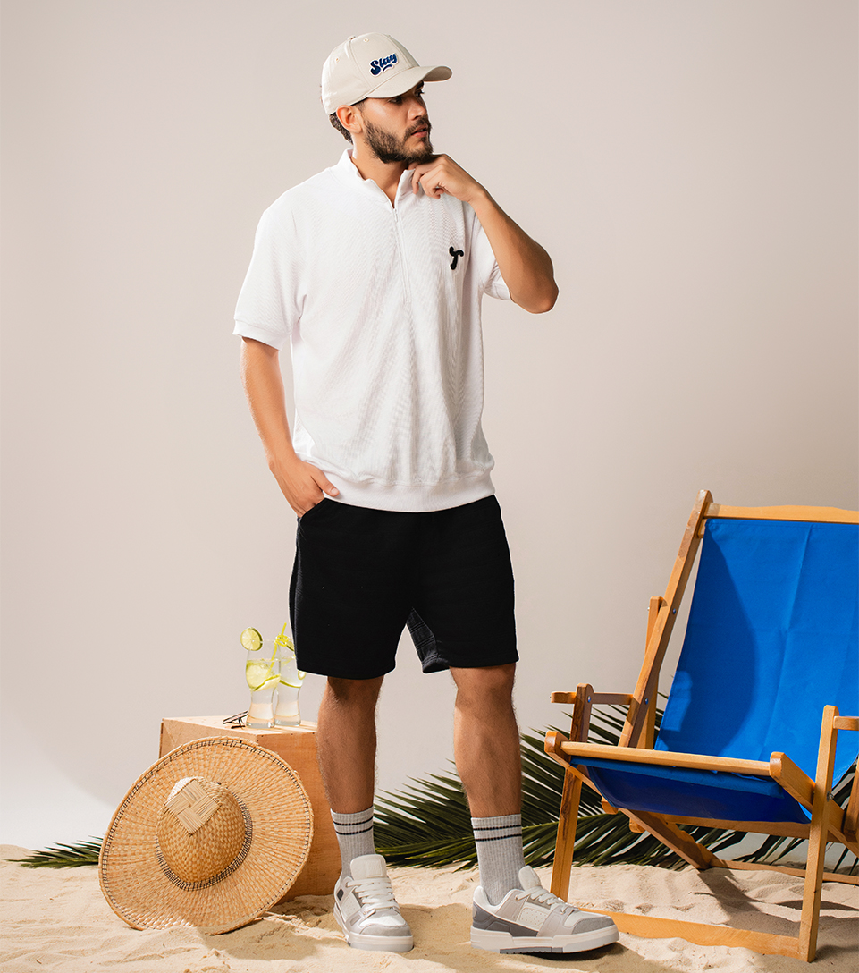 Un look fresco y urbano: el polo con cierre blanco de Typer y la bermuda en burda negra de Typer crean la base perfecta. Las medias caña alta de Unser y los tenis blancos de Typer aportan comodidad, mientras que la gorra bordada caqui de Typer completa el estilo con un toque relajado.