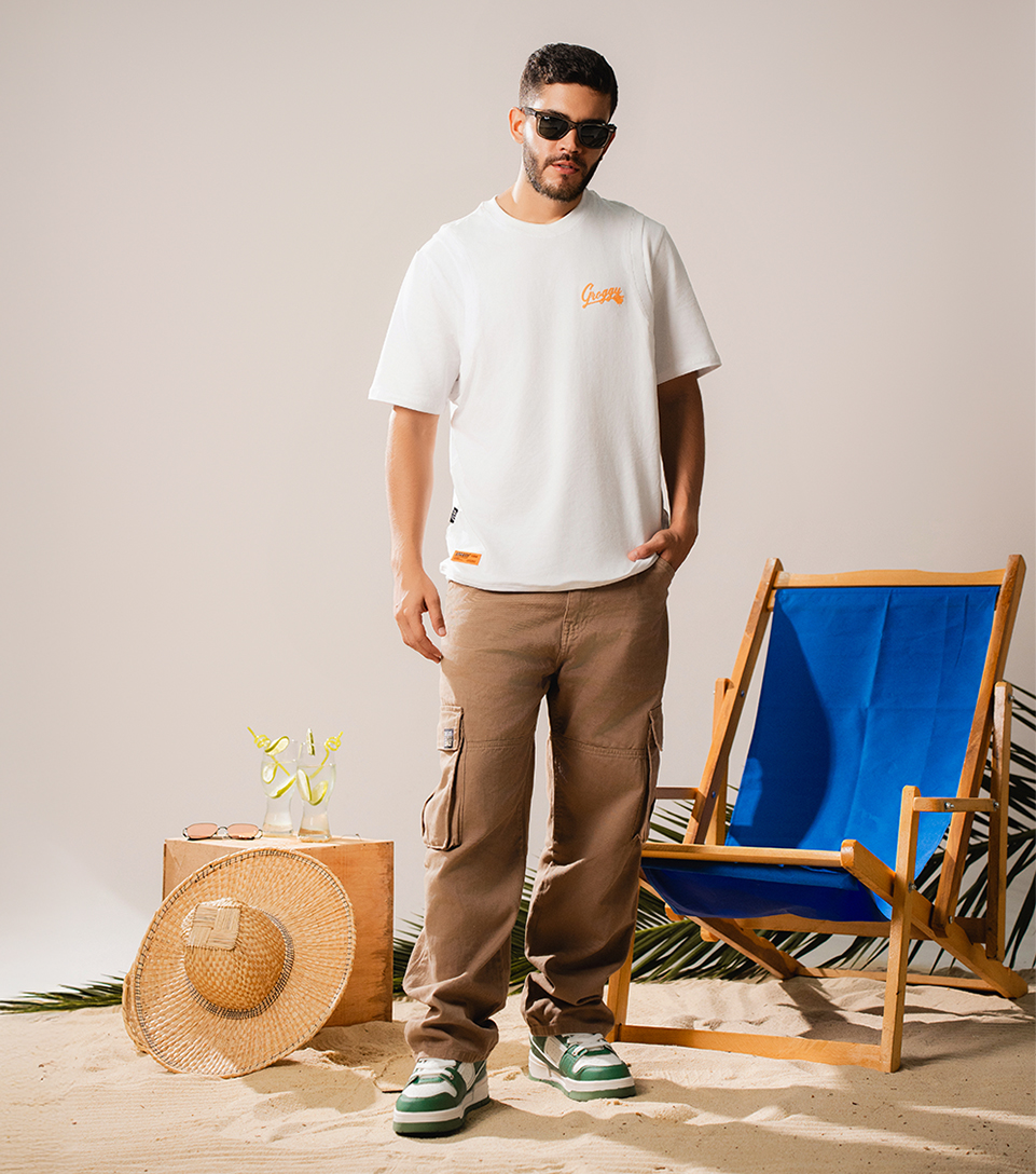 La camiseta blanca de Groggy y el pantalón cargo de Unser se fusionan en un look urbano con la dosis perfecta de estilo relajado. Los tenis blancos con verde de Typer y las gafas completan el conjunto, creando una vibra vacacional que no pierde su esencia auténtica.