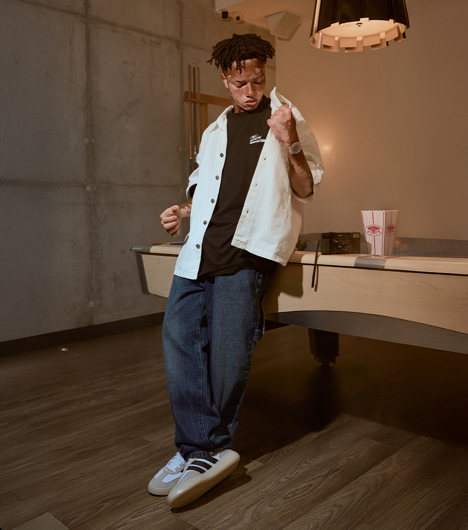 La T-shirt Comfort negra estampada se mezcla con la camisera boxy en crudo bordada en rojo, un jean loose fit azul medio que cae con naturalidad y los Adidas Barreda Decode que completan el combo. Estilo sin esfuerzo, la esencia más pura del Cool Gang Club.