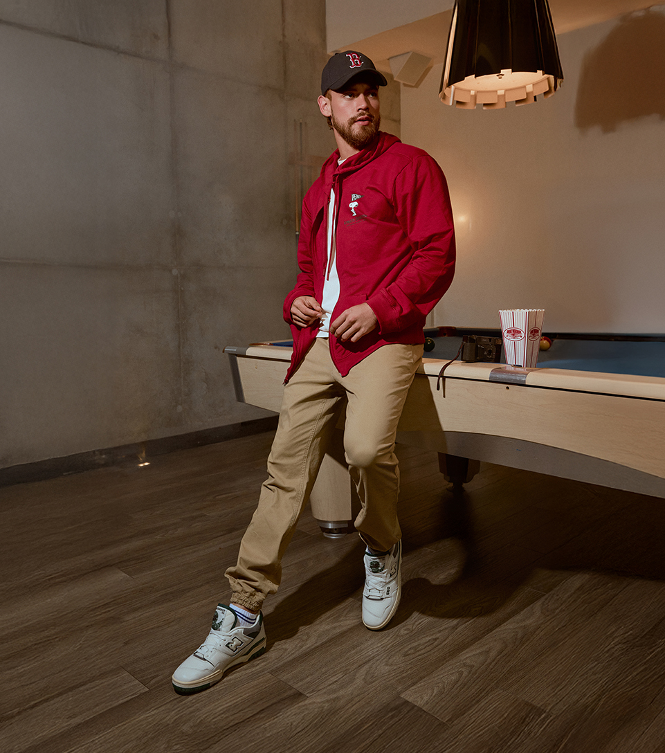 El combo que marca la vibra. Combina la camiseta blanca en rib con buzo rojo de la edición Peanuts x Unser, jogger caqui, gorra 47 Boston Red Sox y New Balance. Diferentes caminos, misma vibra: así se vive el Cool Gang Club.