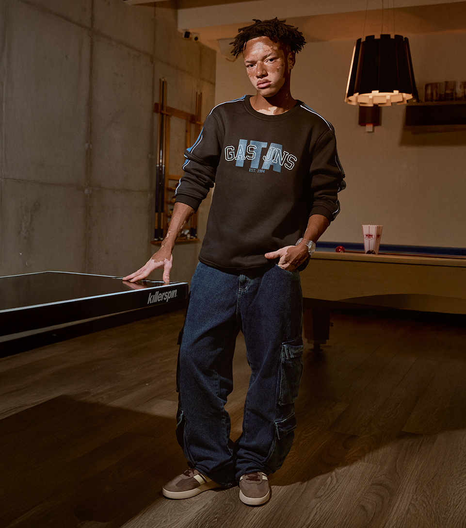 El match perfecto entre estilo y comodidad: buzo masculino Gas con aire relajado, jean cargo relaxed de Typer que suma versatilidad y unos Adidas Barreda Decode que coronan el look con actitud del Cool Gang Club.