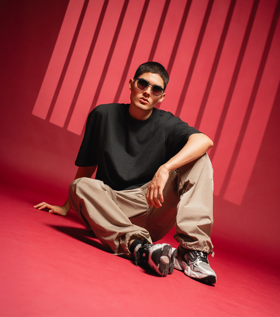 El modelo luce un look urbano relajado con camiseta negra oversized de Typer, pantalones cargo color beige de Typer y tenis deportivas de Replay. Un toque cool y moderno.