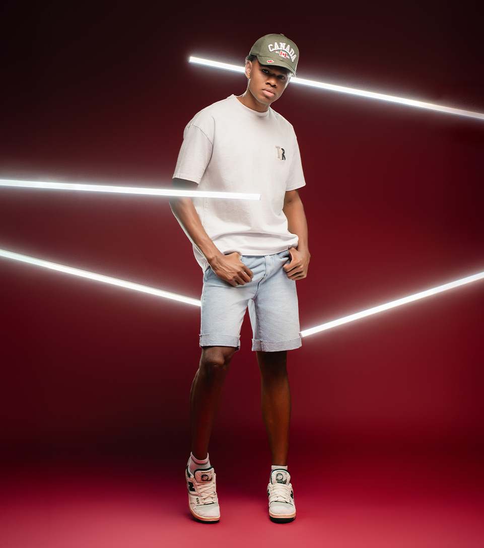 El modelo luce un look urbano fresco y con mucho esti: camiseta blanca sencilla de Typer, shorts de mezclilla claros de Typer y zapatillas deportivas de New Balance, complementado con una gorra deportiva de Groggy. Un estilo fresco y cómodo, perfecto para vivir la euforia de la amistad con tu Squad.
