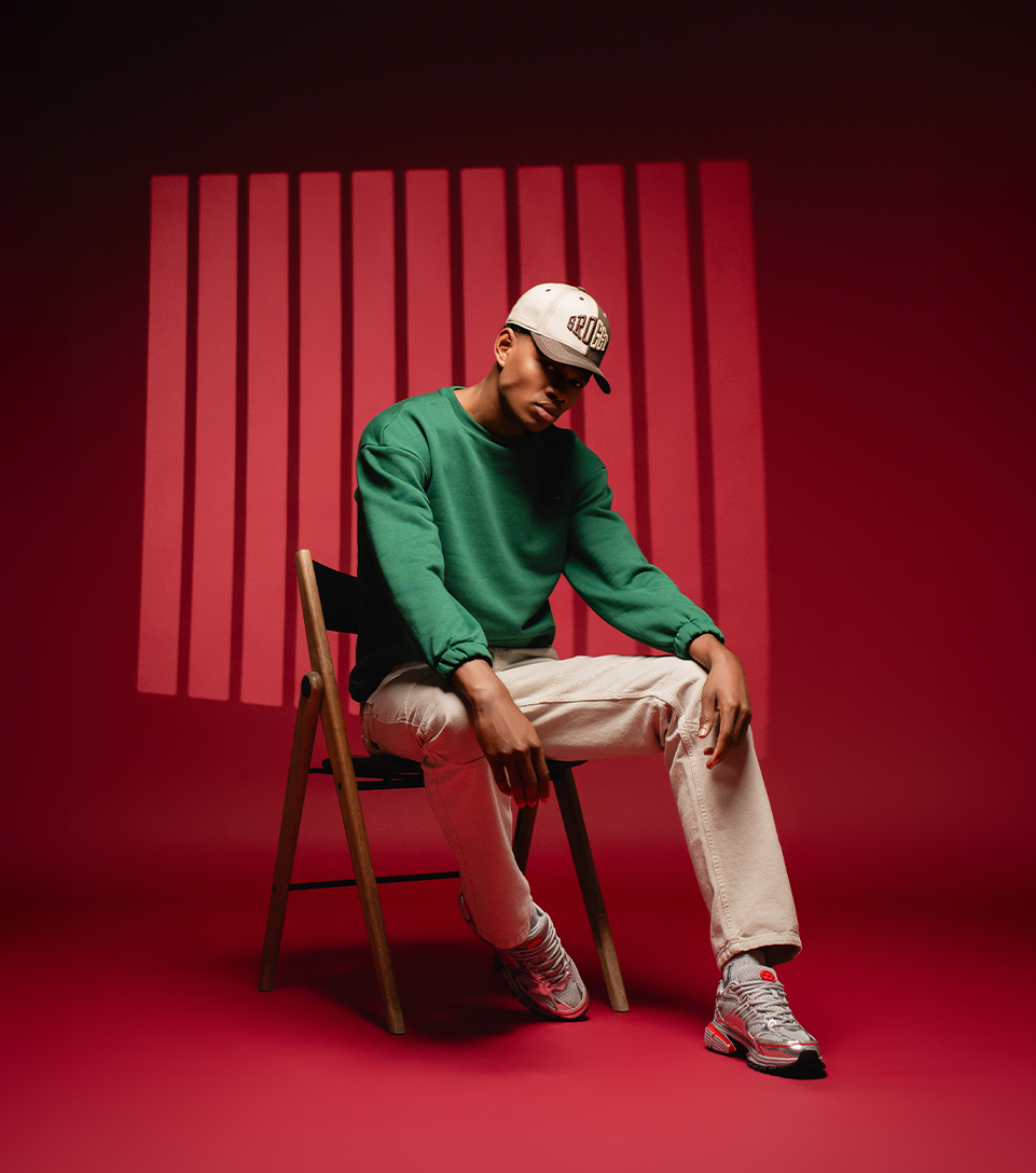 El outfit refleja un estilo urbano relajado y cool: hoodie verde vibrante de typer, pantalones cargo beige de Groggy, tenis plateadas de Diesel. Un look sencillo pero con actitud, perfecto para la energía positiva de la Homies Squad.