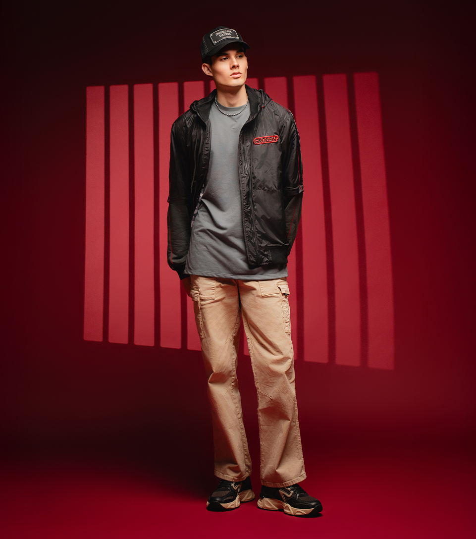 El outfit presenta una estética urbana con una chaqueta negra deportiva de Groggy, una camiseta gris sencilla de Typer, pantalones cargo color beige de Gas y tenis deportivas de Replay. Completa el look una gorra negra que le da un toque informal y cool de john hatter.