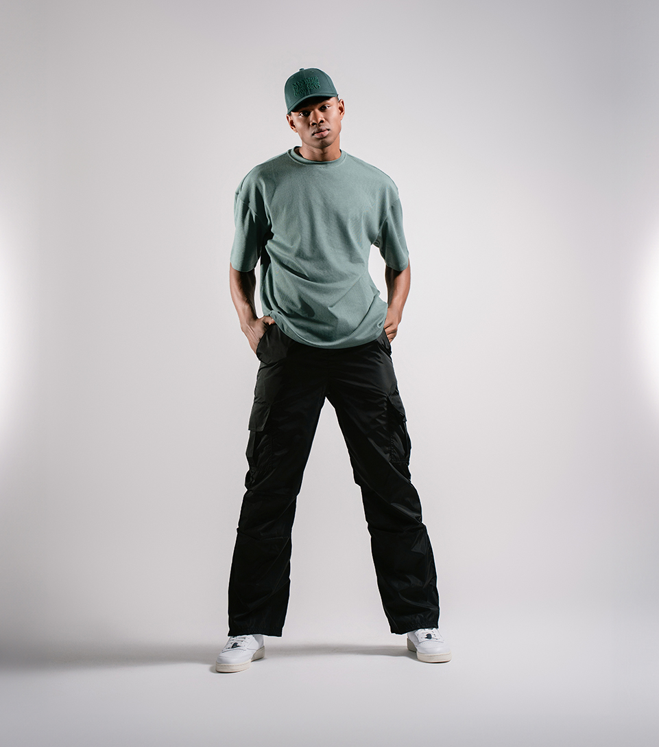 La camiseta t-shirt Juanda extraoversized, destaca por su ajuste amplio y relajado. Acompáñala con un pantalón rompevientos, que no solo ofrece protección, sino que también añade un toque deportivo y funcional a tu atuendo. Completa el look con una gorra en tono verde, que agrega un contraste fresco y un toque adicional de estilo. Finalmente, unos tenis Reebok proporcionan el toque final perfecto con su diseño clásico y cómodo, asegurando que estés a la moda y listo para cualquier aventura.