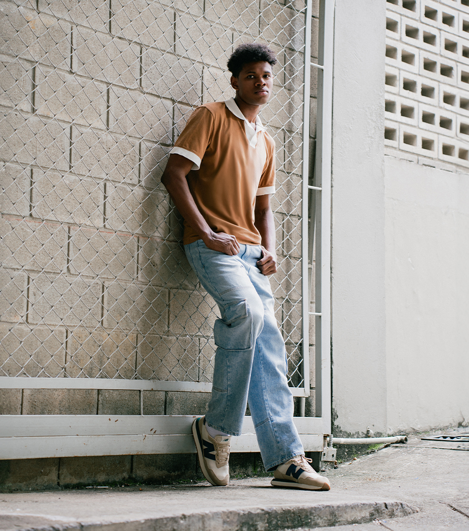 Este look masculino combina modernidad y funcionalidad, ideal para el entorno universitario. Los jeans azul claro tipo cargo ofrecen un ajuste cómodo y práctico, perfecto para un día activo en el campus. Los zapatos New Balance en blanco, azul y beige aportan un toque deportivo y elegante, complementando el conjunto con un diseño atractivo. La camisa marrón con cuello y mangas blancas añade un contraste sofisticado y fresco, ideal para destacar con un toque de estilo clásico. Este outfit es perfecto para aquellos universitarios que buscan un equilibrio entre confort y moda en su día a día.