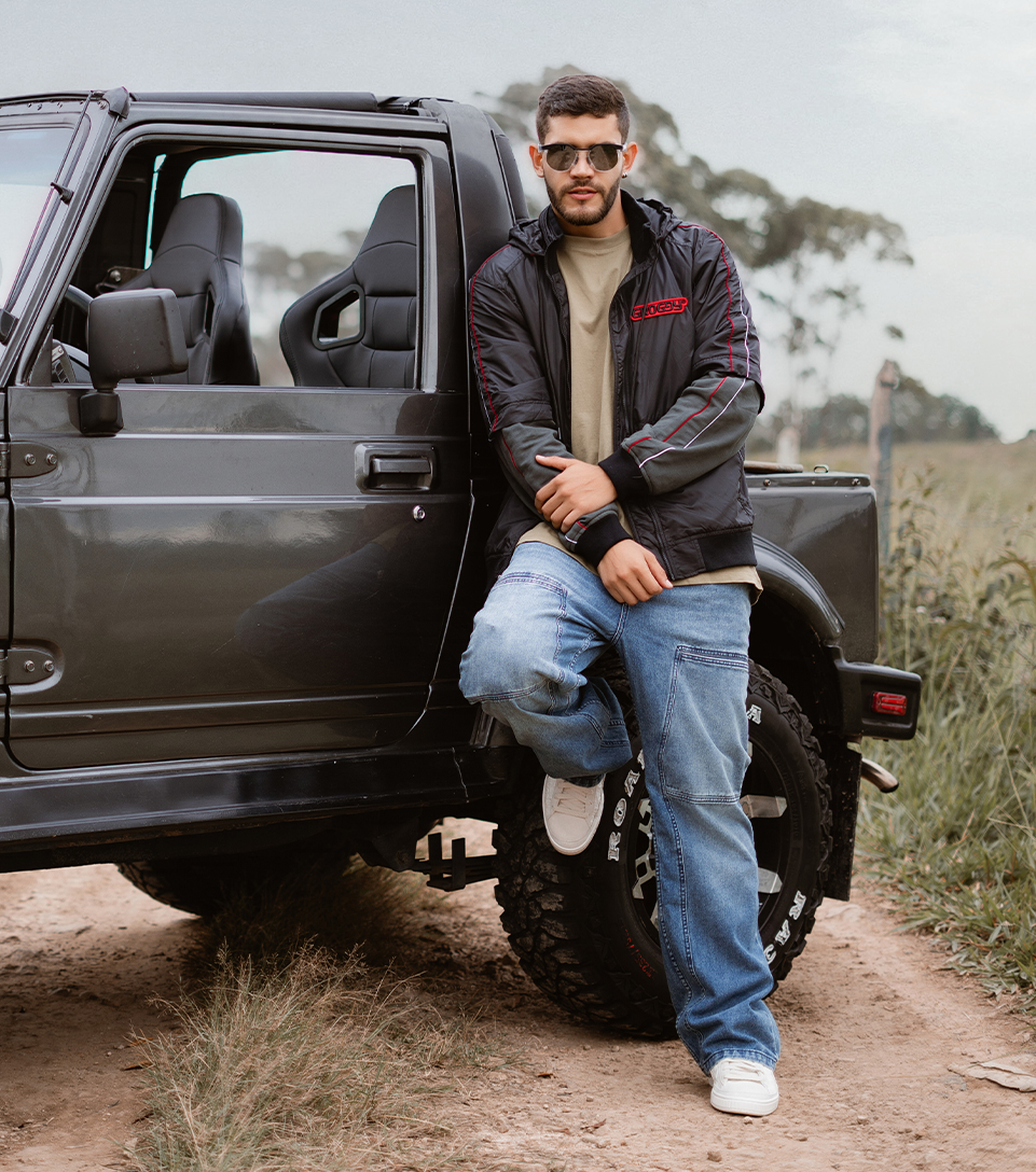 Comodidad y estilo se unen con este outfit perfecto para roadtrips. Una chaqueta bomber negra de Unser, jeans de Girbaud y tenis blancos crean un look equilibrado entre casual y sofisticado. ¡Protegido del sol y listo para explorar!