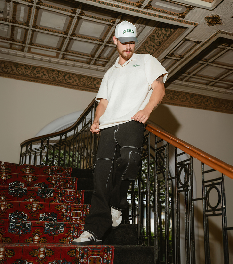 Raw Beige Tempo mezcla sobriedad y estilo urbano con gorra bordada, polo boxy gamuzado y pantalón Connor. Los Adidas VL Court 3.0 suman un toque casual moderno y relajado.