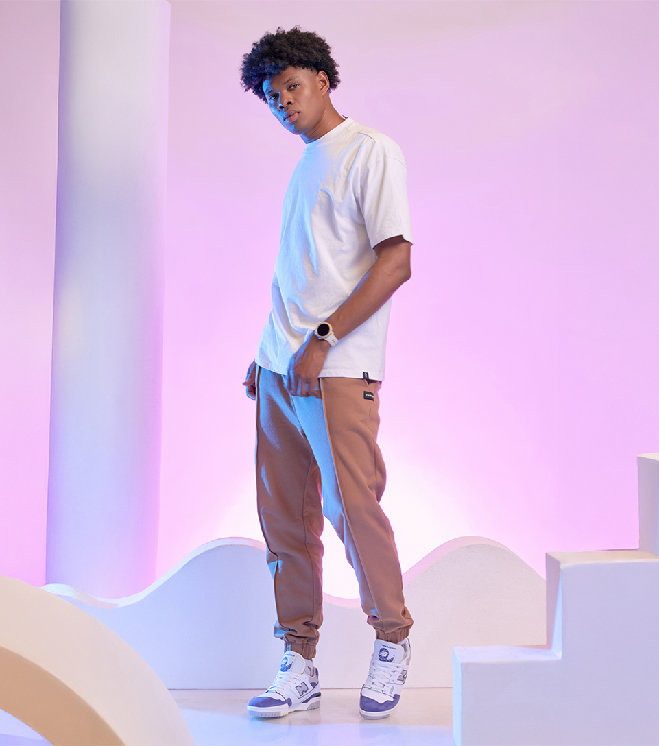 Comodidad sin perder estilo. La T-shirt Confort de Typer en blanco y el jogger café en burda de Typer crean una combinación perfecta para un look relajado. Los tenis New Balance Homme cierran el conjunto con un toque moderno, ideal para quienes buscan versatilidad y actitud en su día a día.