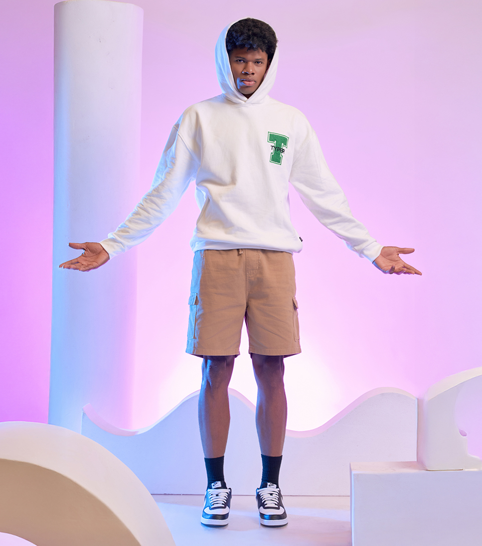 Flow limpio, presencia fuerte. Hoodie oversize arena y bermuda cargo caqui de TYPER en combo con los Nike Court Vision: una fórmula infalible para dominar el verano con estilo callejero y sin esfuerzo.