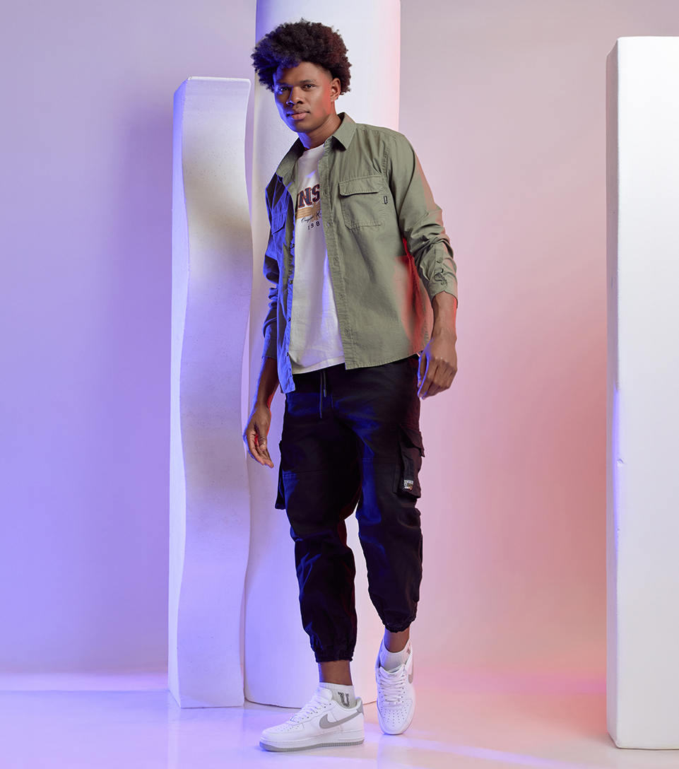 La comodidad también puede imponer estilo. La camiseta y la camisa verde de manga larga, ambas de Unser, se combinan en capas que suman actitud sin esfuerzo. El jogger en dril negro y las medias al tobillo, también de Unser, completan la base perfecta para unos Nike Air Force 1 '07 que sellan el look con fuerza.