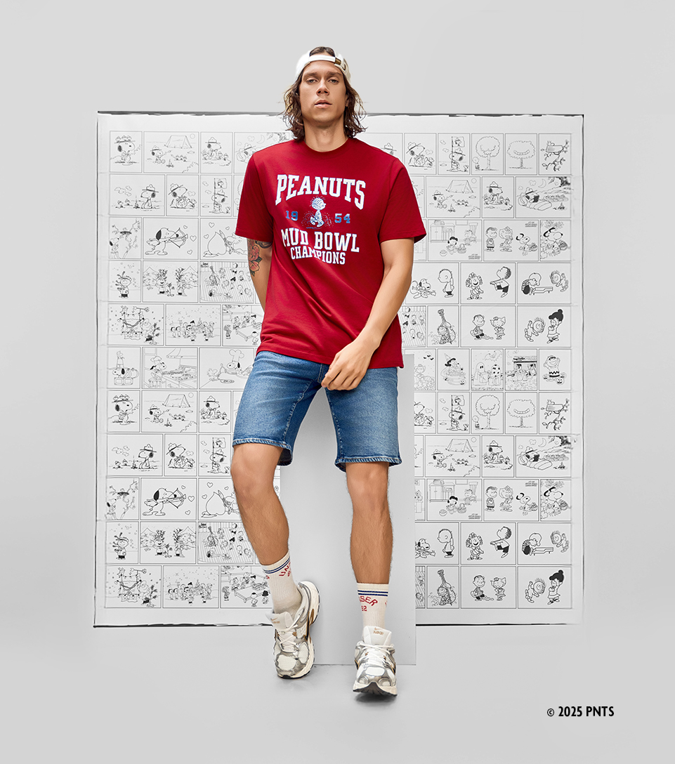 Un look que lleva el universo Peanuts a la calle. La camiseta roja de la colaboración UNSER x PEANUTS es el centro del outfit, combinada con gorra blanca, bermuda en denim y los Nike V5 RNR que le suman actitud callejera. Relajado, pero con presencia.