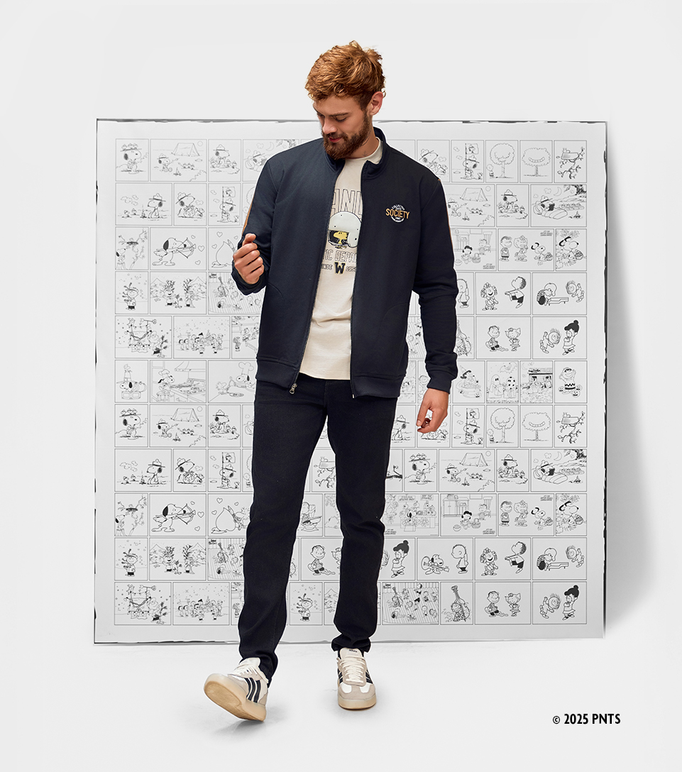 Snoopy también sabe de estilo. Camiseta de la colaboración UNSER x PEANUTS, buzo negro con cremallera, jean bota skinny negro y los Adidas Barreda Decode que rematan un look pensado para moverse con confianza.