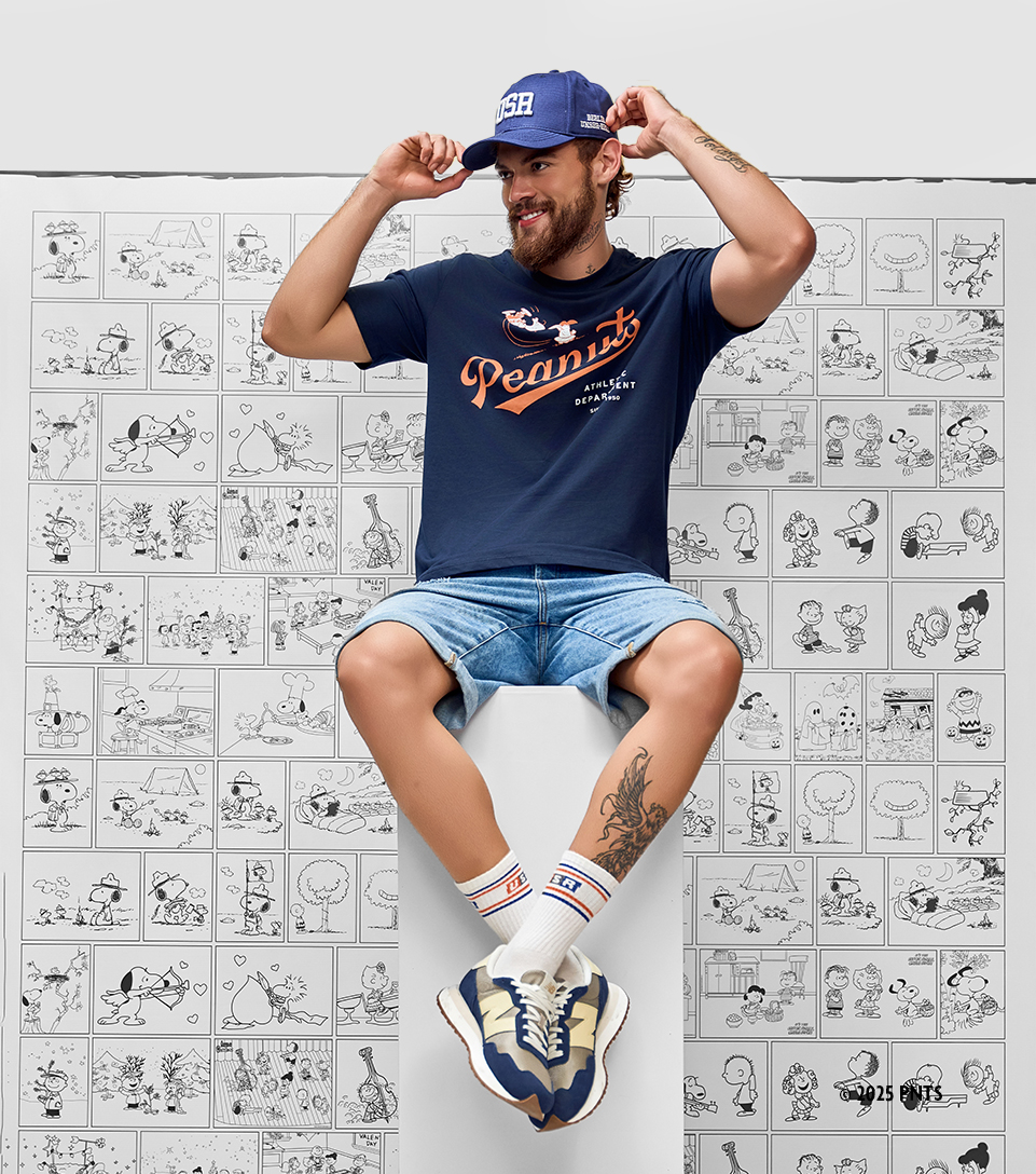 Un look pensado para tomarse el día con calma. Camiseta de la colaboración UNSER X PEANUTS, gorra a juego, bermuda en denim y New Balance 237 que suman estilo sin esfuerzo. Todo encaja.