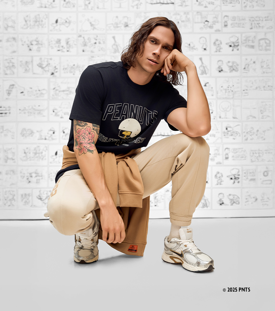 La camiseta negra de la colaboración UNSER x PEANUTS marca el inicio de un look relajado. El jogger caqui y el buzo anudado a la cintura suman actitud sin esfuerzo, mientras los Nike V5 RNR rematan con energía urbana.