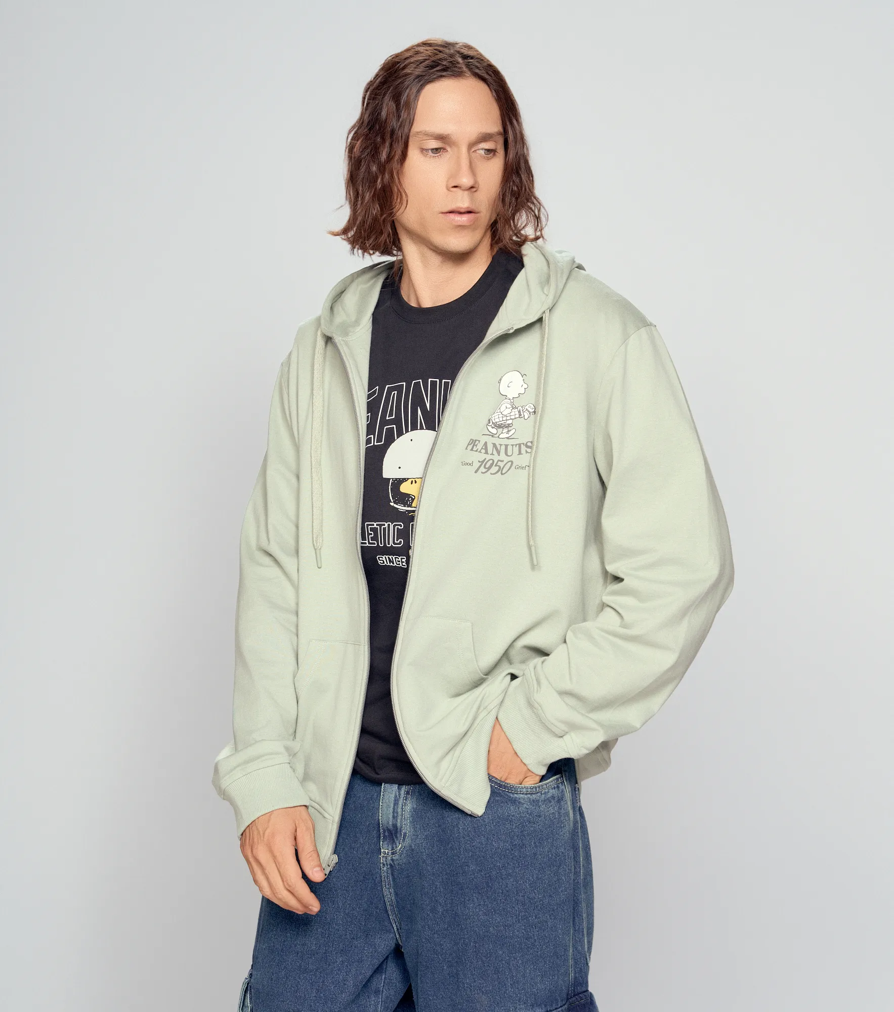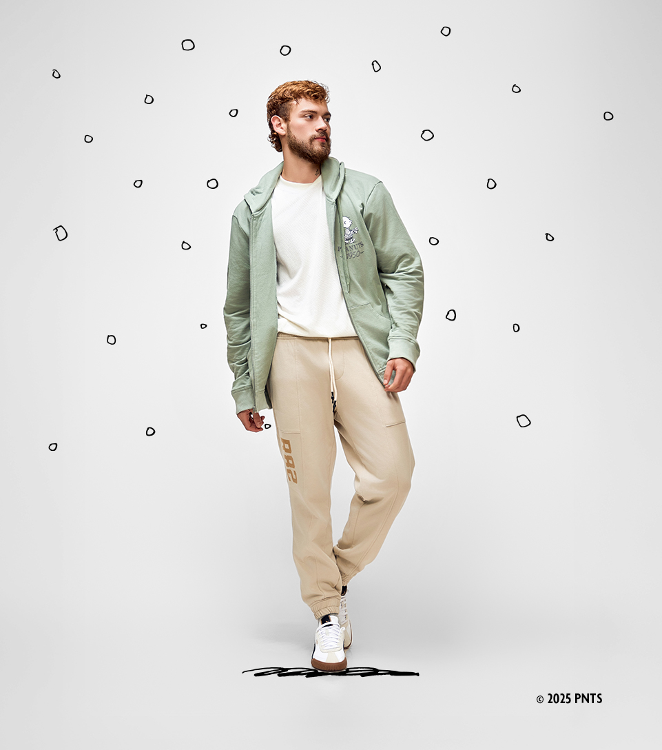 Peanuts no es solo un recuerdo, es parte del estilo. Camiseta blanca + hoodie de la collab UNSER x PEANUTS, jogger cómodo en tono caqui y tenis Puma Club Kayzer OG para andar sin prisa. Un outfit pensado para moverse con onda.