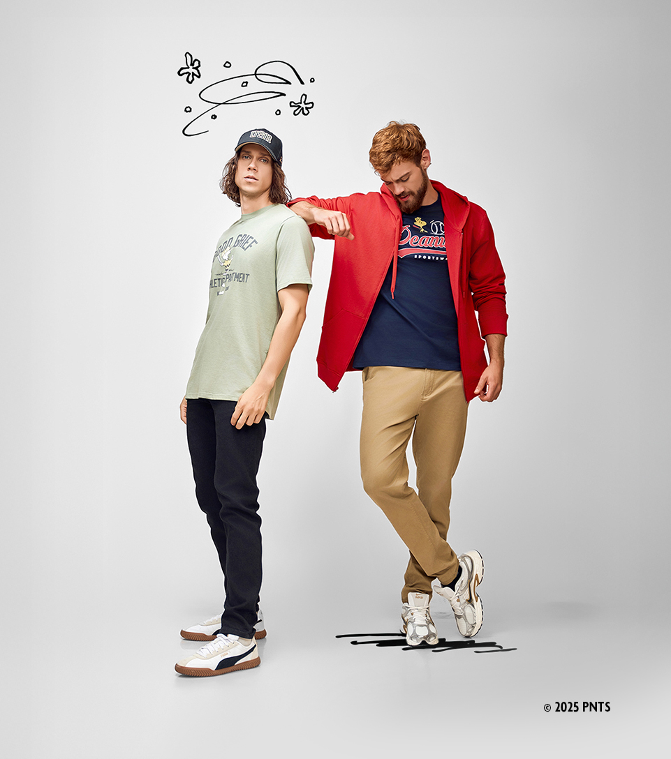 Dos estilos, misma esencia. El primero apuesta por una camiseta de la colaboración Peanuts x UNSER, jean skinny negro, gorra UNSER y tenis Puma Club Kayzer OG que bajan el tono con estilo. El segundo combina hoodie de la colaboración Peanuts x UNSER sobre camiseta blanca, pantalón en drill caqui y tenis Nike V5 RNR para cerrar con flow.