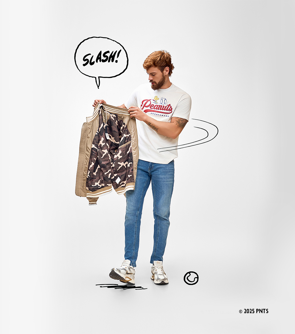 Peanuts para los que crecieron, pero, no perdieron el estilo. El look empieza con una camiseta de UNSER x PEANUTS, se ajusta con un jean skinny y toma forma con una chaqueta que lo eleva. Los Nike V5 le dan el cierre urbano que todo outfit pide.