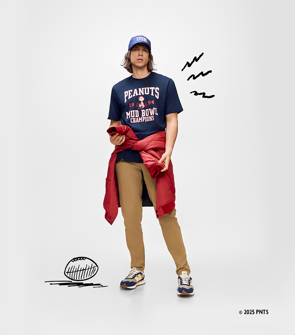 Peanuts para los que crecieron, pero, no perdieron el estilo. El look empieza con una camiseta de la colaboración UNSER x PEANUTS, que se combina con una gorra azul. Un pantalón en drill caqui y una chaqueta roja anudada a la cintura le dan un giro más atrevido. Los New Balance 237 cierran el outfit con un toque clásico y relajado.