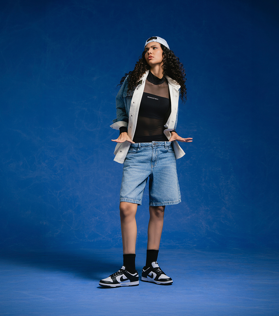 Estilismo de streetwear enfocado en la superposición ingeniosa. La pieza clave es una chaqueta híbrida que fusiona mezclilla con una camisa blanca, llevada sobre un body de malla negro para un contraste texturizado. Se completa con shorts de bermuda de mezclilla a juego y una gorra invertida, logrando un look utilitario y moderno.