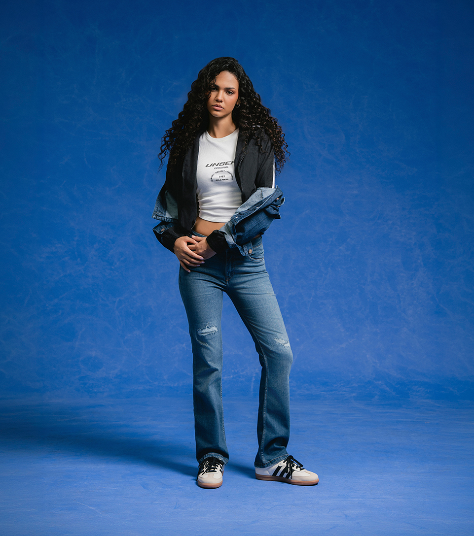 Estilo streetwear que redefine el arte de las capas. Presenta una chaqueta híbrida deconstructiva que fusiona cortavientos y mezclilla, llevada sobre un crop top acanalado con gráfico "Unser Original". Se completa con vaqueros ajustados de lavado medio con sutil desgastado para un equilibrio perfecto de estética DIY.