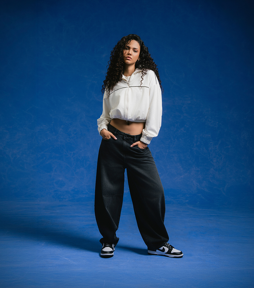 Conjunto streetwear basado en el contraste de proporciones y paleta bicromática. Compuesto por una chaqueta deportiva blanca de corte crop con vivo negro horizontal y ajustes elásticos, combinada con jeans negros de silueta baggy y tiro medio. Estética utilitaria y de clara inspiración deportiva.