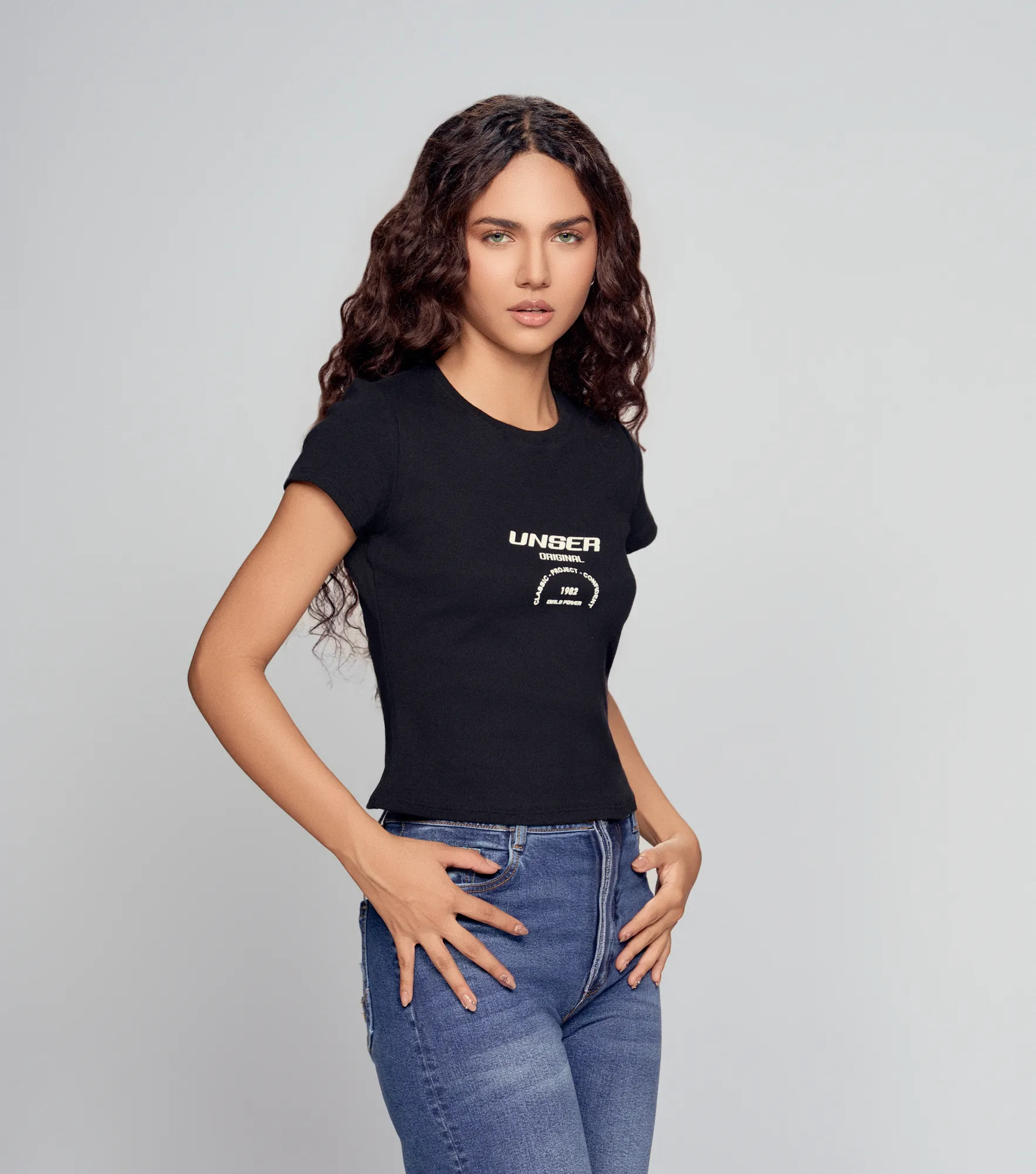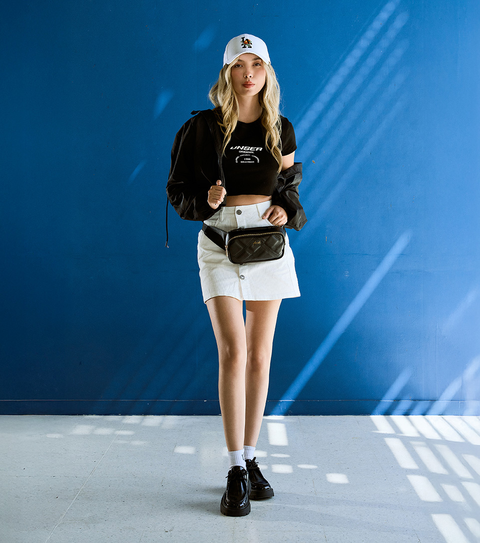 Back To Black & White es un look que juega con el contraste clásico en clave moderna y femenina. La camiseta y falda UNSER crean una base equilibrada, mientras la gorra NEW ERA con la chaqueta rompevientos UNSER aportan una auténtica actitud urbana. Las medias complementan a la perfección los zapatos negros de corte único, con el canguro Derek ideal para llevar tus artículos esenciales.