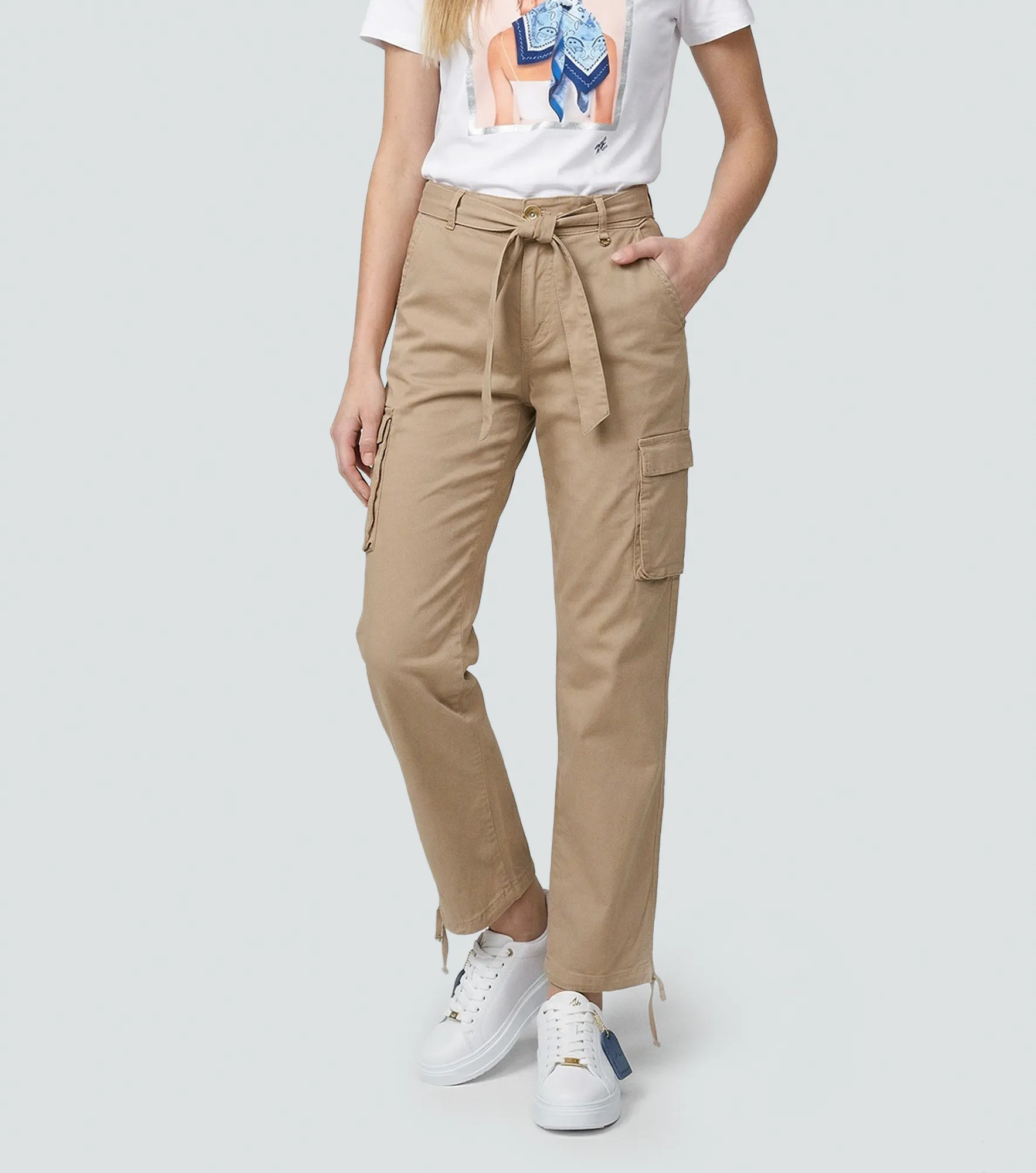 Un look en tonos tierra que transmite fuerza suave y elegancia natural. La chaqueta clara aporta ligereza, la blusa estructurada en caqui define la silueta con carácter, el pantalón cargo suma equilibrio entre utilidad y estilo. Los sneakers blancos cierran con frescura limpia y urbana.
