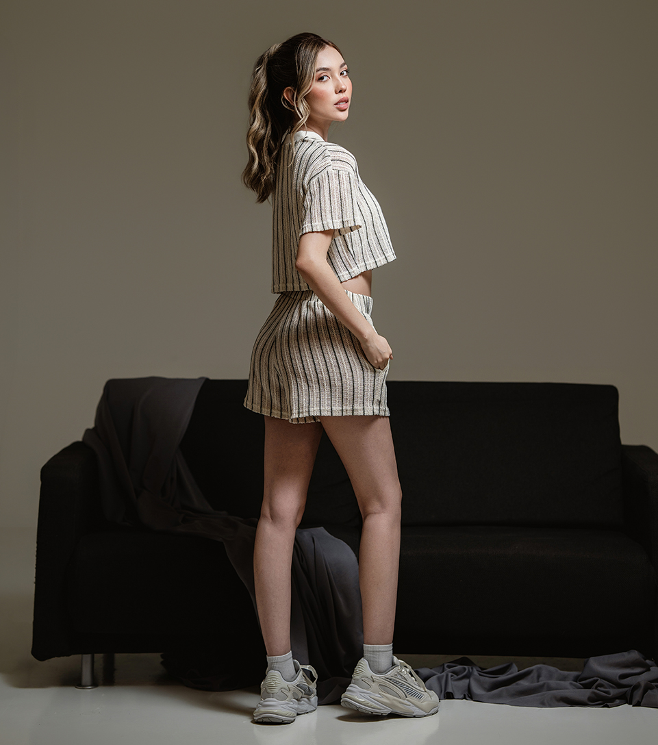 Un look street clásico y energía moderna. El conjunto de dos piezas de Typer define la silueta con carácter, mientras la base crema asegura limpieza y equilibrio visual. El short de tiro alto con bolsillos suma funcionalidad y textura urbana, y los chunky sneakers, con su estética robusta, refuerzan la vibra dinámica y el contraste utilitario.