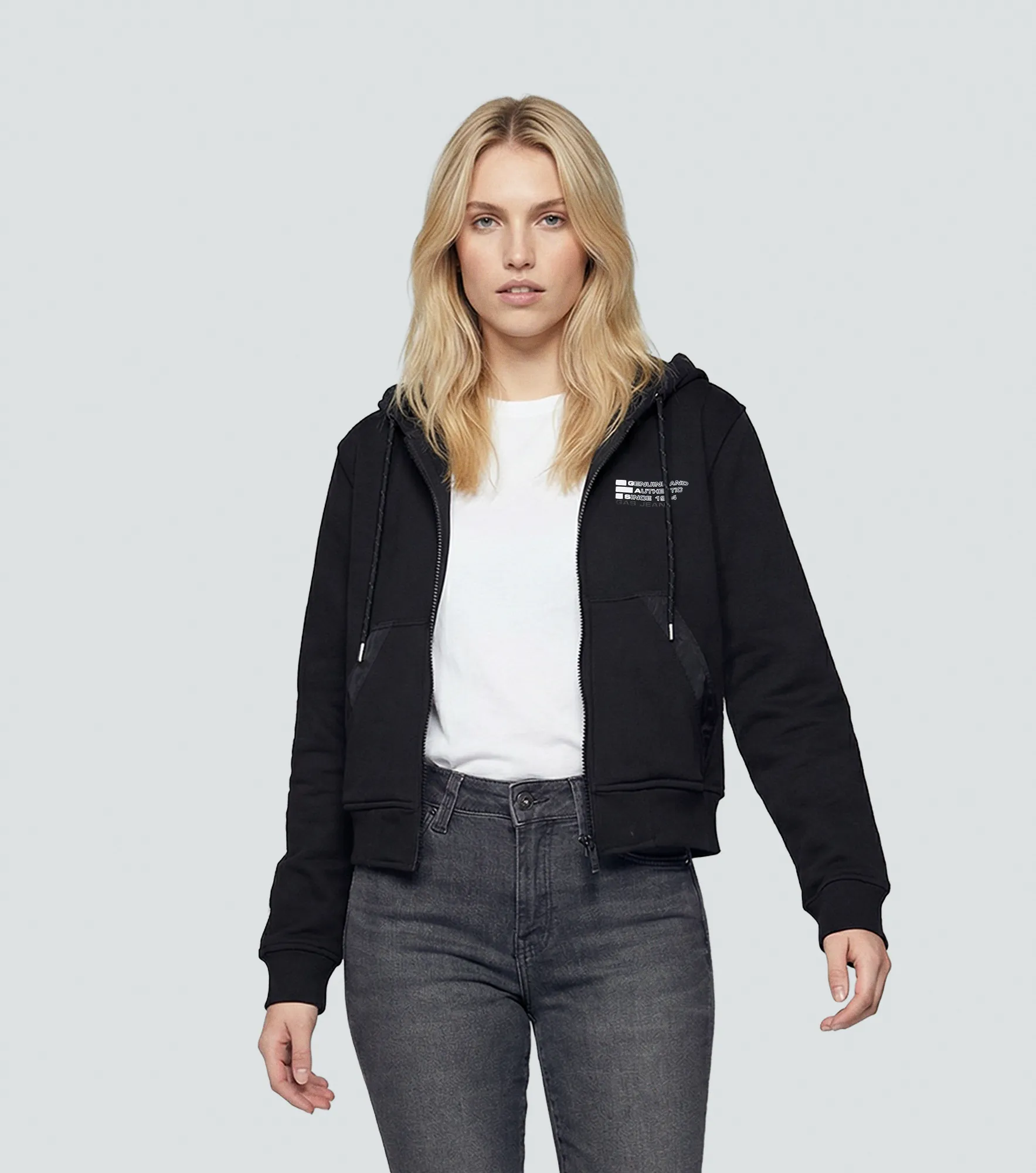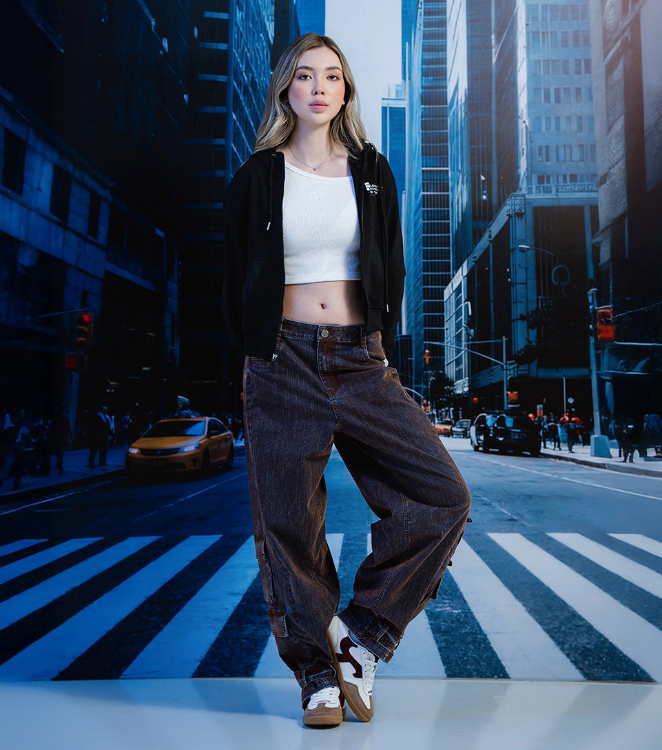 Un look urbano con esencia relajada y moderna. La chaqueta negra aporta actitud y contraste sobre la blusa blanca ajustada, mientras el jean amplio de tiro bajo suma comodidad y estilo desenfadado. Las zapatillas completan el conjunto con un toque casual y versátil, ideal para un día en la ciudad con personalidad auténtica.