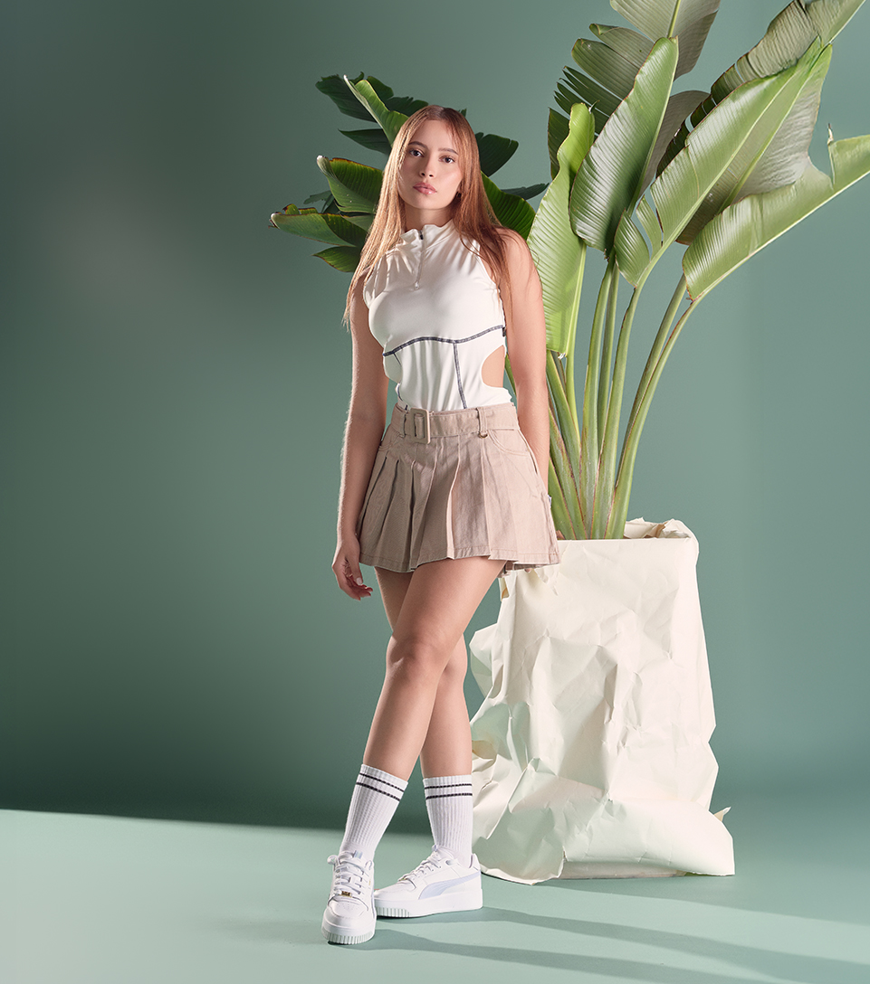 Equilibrio perfecto entre actitud y estilo. Body de cuello alto de Typer, falda corta con pliegues en color caqui de Derek y medias canilleras de Unser. Completa el look con tenis Puma Street para un look que fluye entre lo casual y lo urbano.