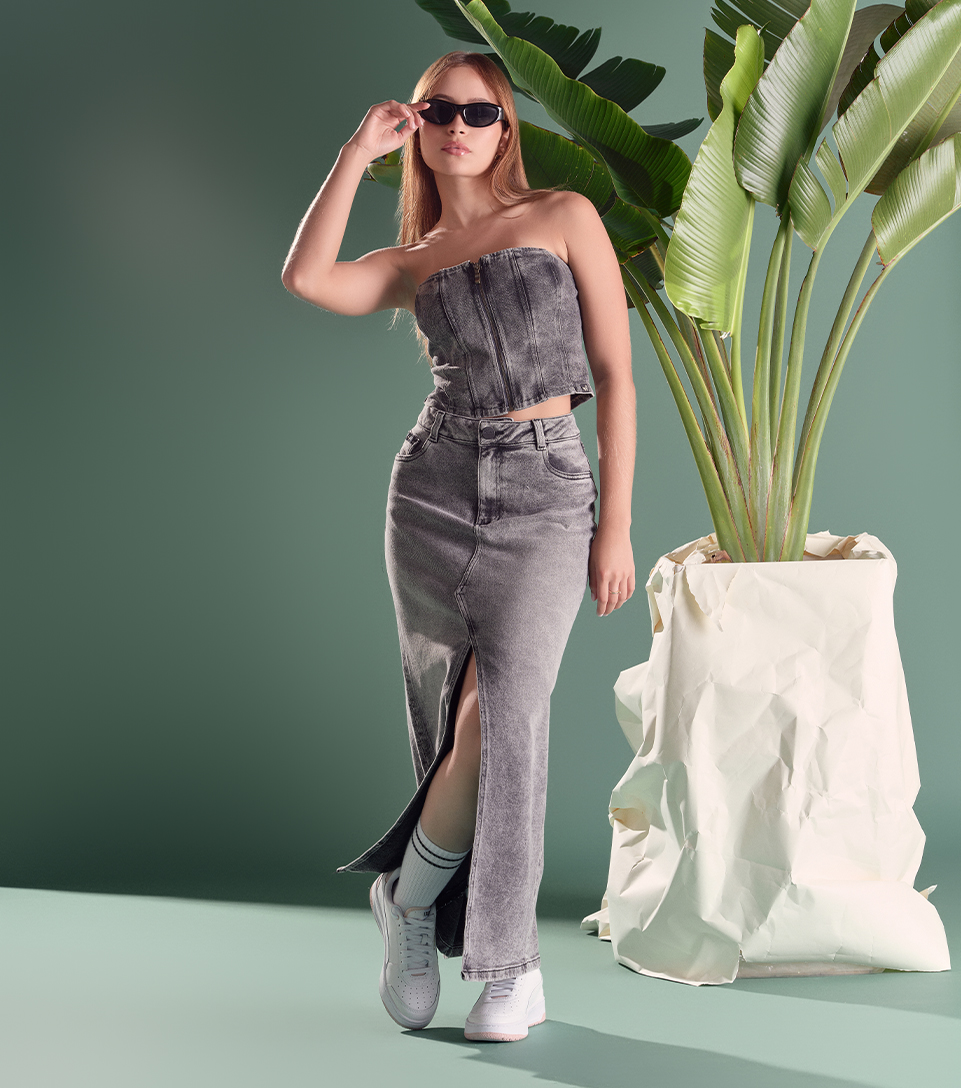 Denim de pies a cabeza, actitud en cada detalle. Blusa strapless y falda larga con abertura de Unser para un look que equilibra frescura y estilo. Las medias canilleras y los tenis Puma Ca Matc refuerzan la vibra urbana, mientras que las gafas de sol negras le suman el toque final. Porque el flow está en los detalles.