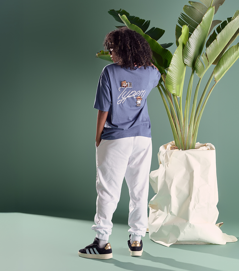 Streetwear que se siente tan bien como se ve. Camiseta azul Typer con bordados en la parte delantera y trasera, jogger blanco Unser y tenis Adidas Campus. Completa el look con gafas negras y deja que el flow hable por ti.