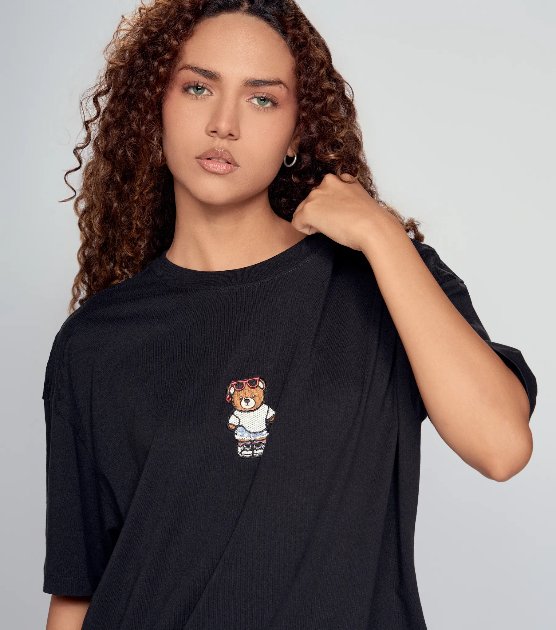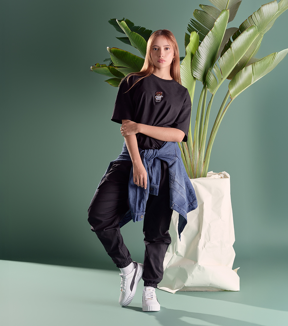 Negro, denim y flow sin reglas. Un outfit que combina comodidad y estilo sin esfuerzo, camiseta oversize negra con estampado delantero y en espalda de Typer, joggers cargo negros de Typer y tenis Puma Carina 3.0. La chaqueta de jean Unser atada a la cintura marca el diferencial.