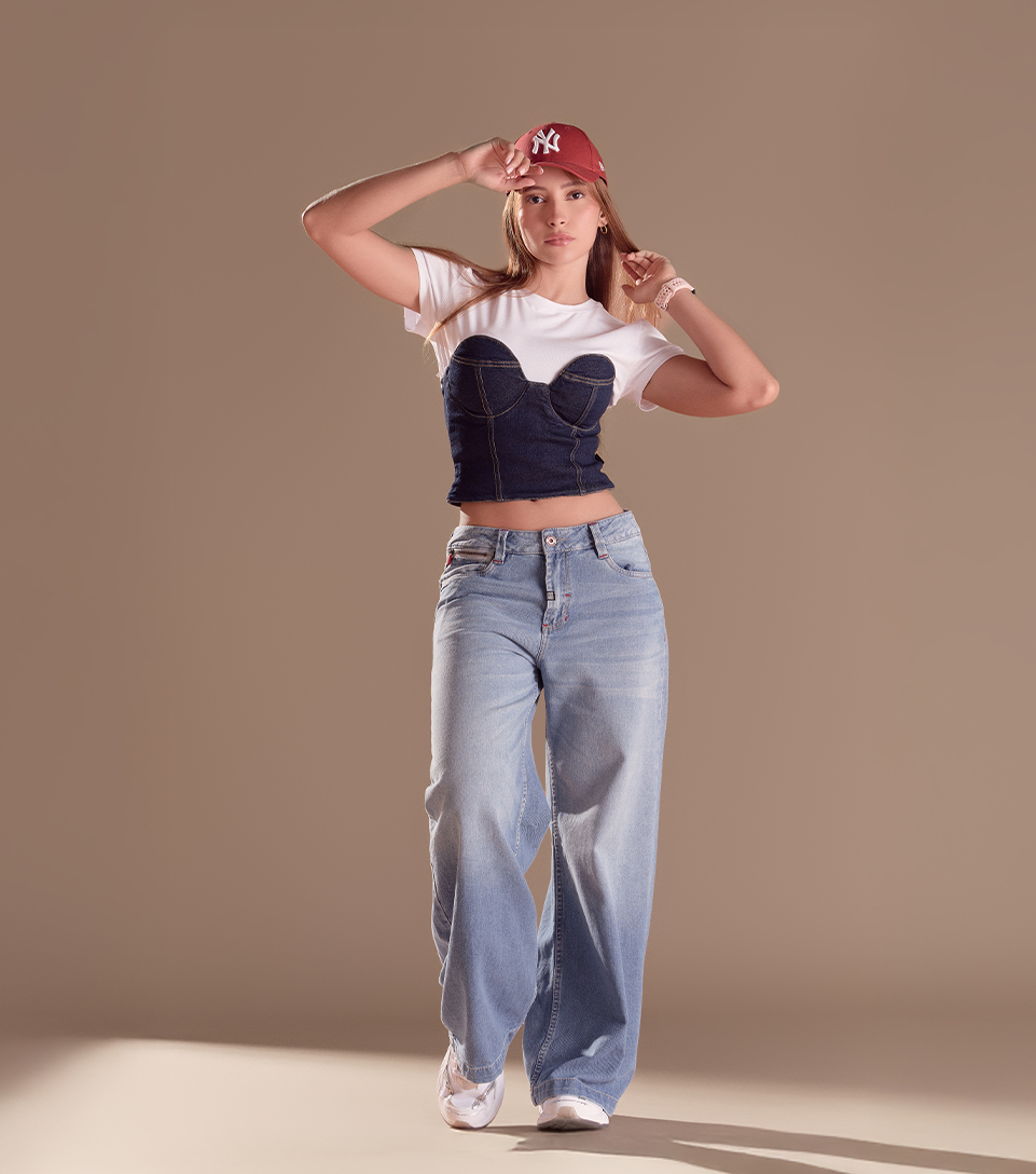 Denim con carácter. El corset en denim slim fit de Typer define la silueta con fuerza, mientras que la blusa blanca de Derek aporta el equilibrio perfecto. Un jean clásico y la gorra New Era CHTY League completan un look fresco y lleno de actitud.