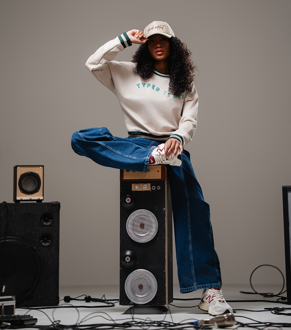 Beat Spectrum fusiona ritmo y estilo con el camibuzo Zary oversize, proyectando actitud y movimiento. El jean Atena wideleg aporta soltura y presencia, mientras la gorra Samantha Derek y los tenis New Balance Lifestyle completan un look con flow auténtico y energía vibrante.