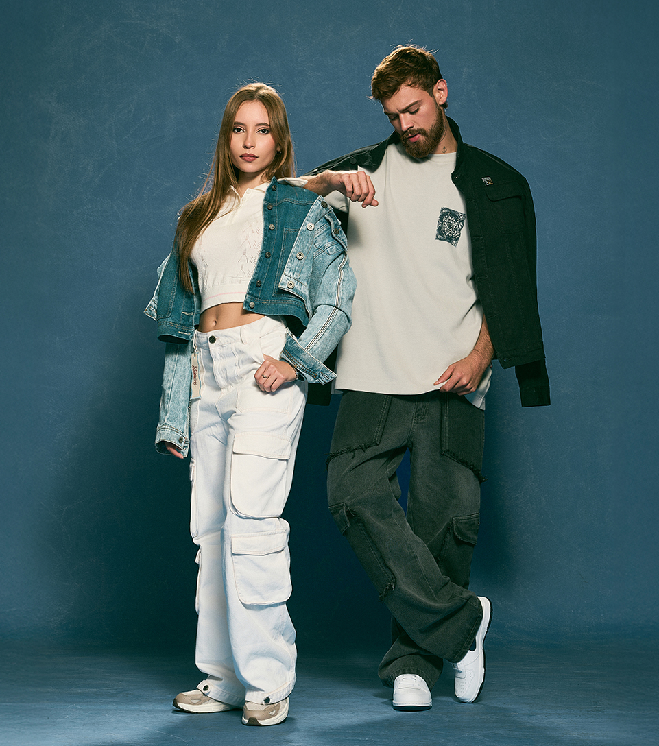 Stylized White Match representa la sofisticación urbana para ambos. Fusiona la versatilidad de la chaqueta Unser y la chaqueta Typer, la blusa Lovely y el pantalón cargo Typer de ella, con la audacia de la chaqueta Unser, la camiseta Clemont y el jean Artdist de él. Con tenis Adidas para ella y Nike para él, este conjunto celebra un estilo coordinado pero con personalidad individual, ideal para la pareja moderna que domina la ciudad con una estética impecable y cohesiva.