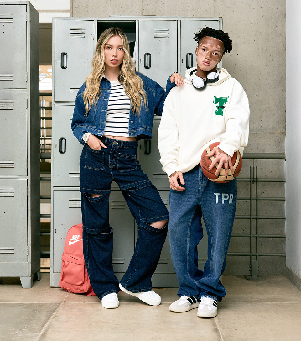Los looks Match High School combinan estilo y confort para un regreso a clases con personalidad. Él luce un hoodie oversize con jean recto TYPER y tenis adidas Barreda Decode, creando un outfit relajado y moderno. Ella apuesta por un look urbano con jean wideleg, chaqueta tipo boxy, blusa UNSER, Nike Court Vision Alta y accesorios funcionales como morral y reloj G-Shock.