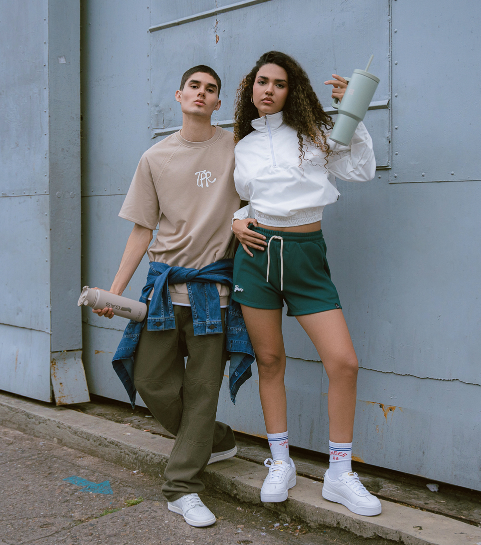 La ciudad es tu escenario, y tu estilo, el protagonista. Descubre nuestra nueva colección. Para él, una camiseta beige minimalista de Typer, pantalones cargo de estilo utilitario de la marca Groggy y una chaqueta vaquera de Levis que aporta el toque informal perfecto. Ella irradia estilo con una chaqueta de Typer con cremallera, unos shorts deportivos elegantes de la marca Typer y tenis blancos de Puma. ¡Combinaciones ganadoras para un estilo urbano inigualable!